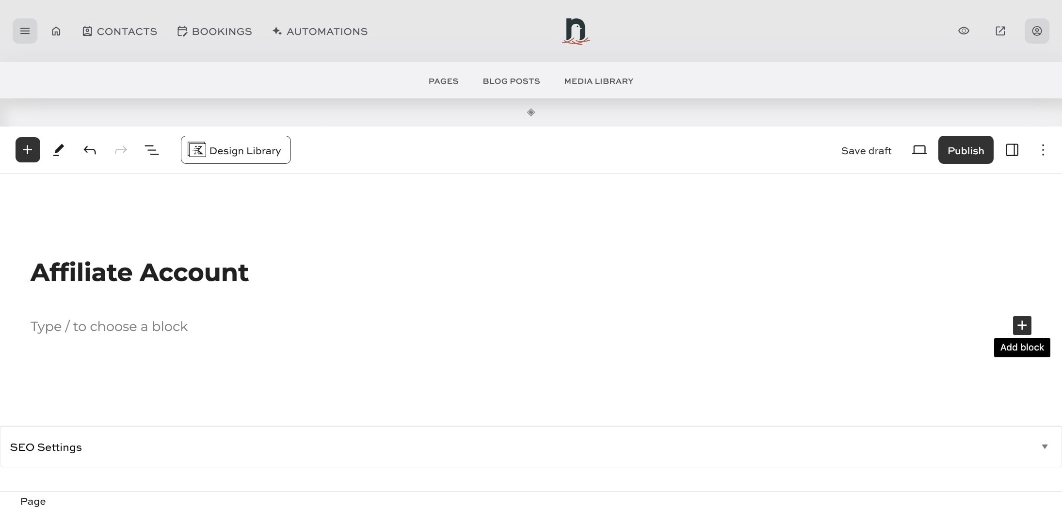 Paste the following shortcode into the shortcode block: [slicewp_affiliate_account]